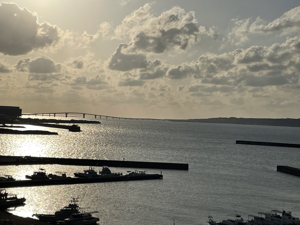 宿泊先は、宮古島の中心部に位置するホテルアトールエメラルド宮古島です。全室オーシャンビューで、お部屋から伊良部大橋へ沈む夕日を眺めることができました。